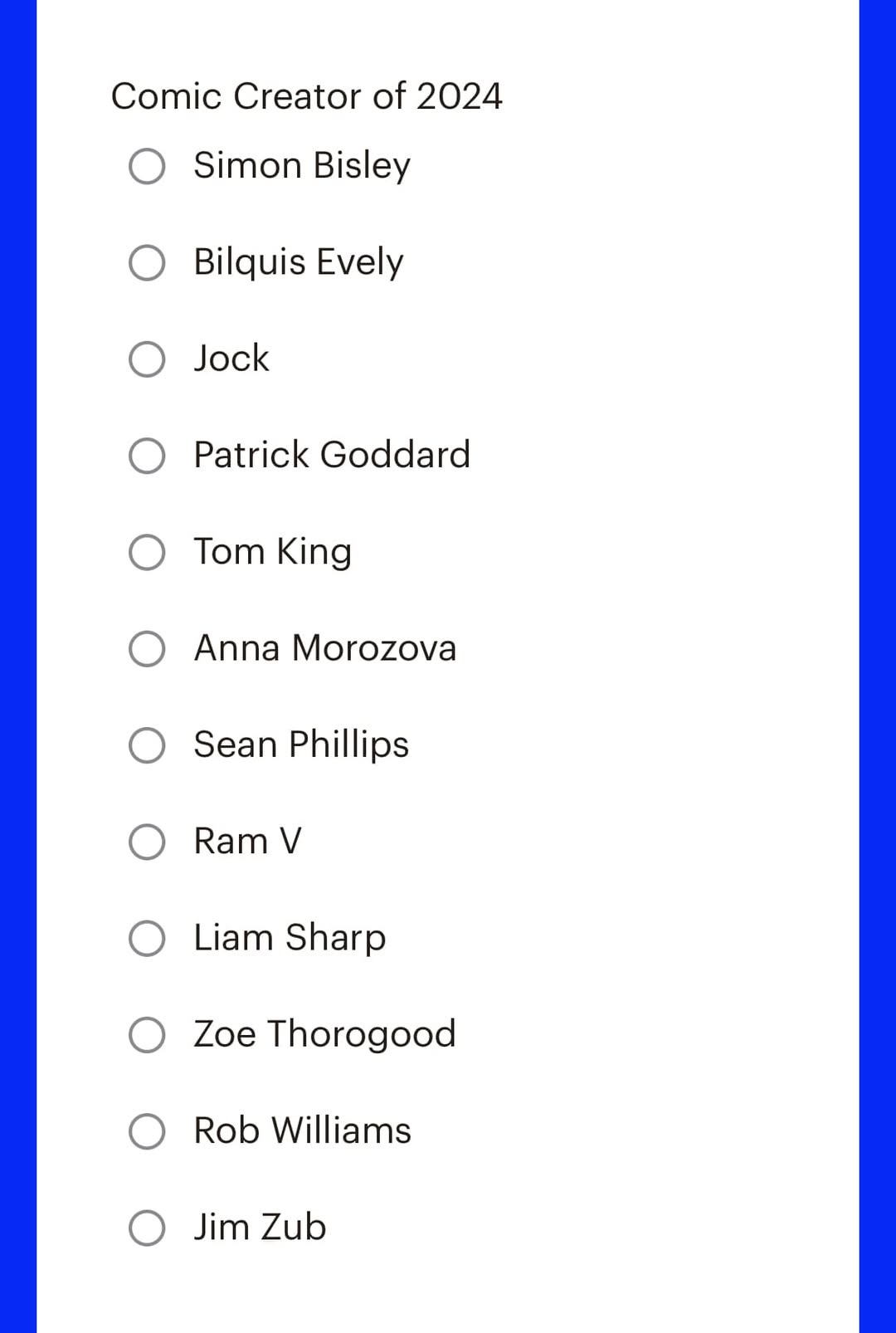 I’ve been nominated in astonishing company by Comic Scene for… well, whatever it is I do in general in the comics biz! Here’s the link for voting purposes, and here’s the rather wonderful company I’m in!